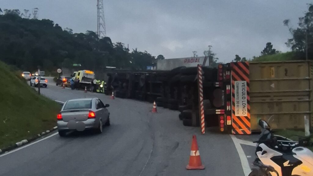 Uma carreta bitrem tombou na Estrada Caminho do Mar, no acesso à Rodovia Índio Tibiriçá, em São Bernardo do Campo (SP), na tarde desta terça-feira (27). O veículo, que transportava dois contêineres, acabou tombando ao realizar uma curva no trecho que segue em direção a Ribeirão Pires. De acordo com informações preliminares, o estouro do […]