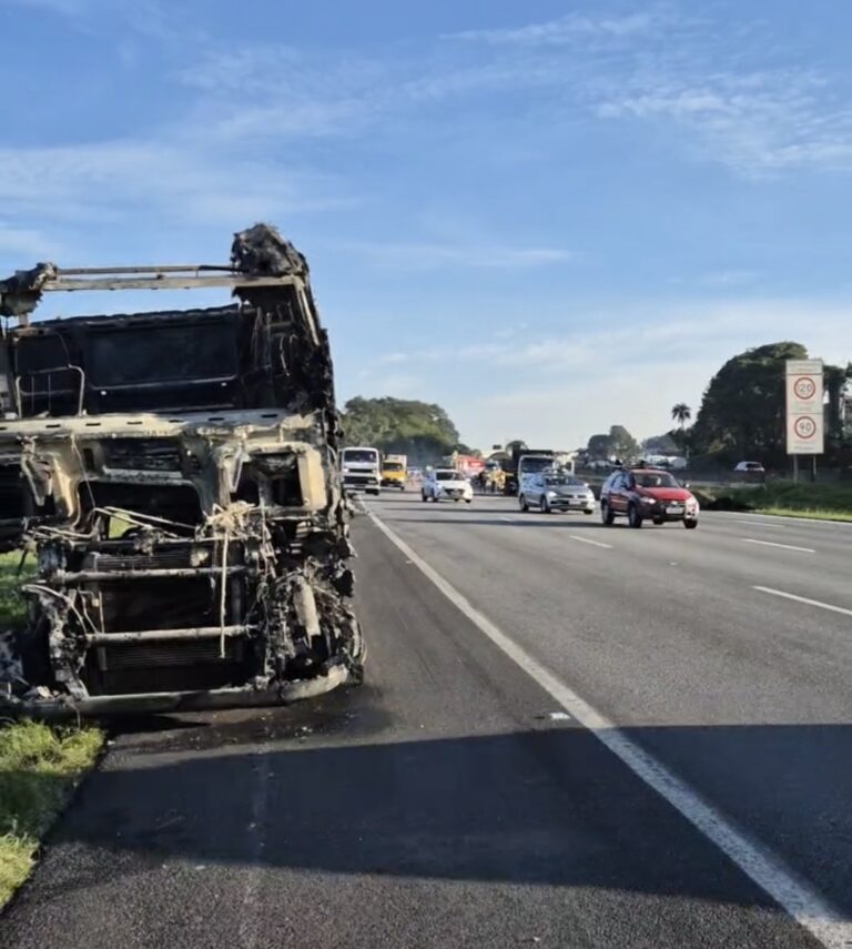 Equipes do Corpo de Bombeiros e da concessionária atuaram no combate às chamas e na remoção da carga, que ficou espalhada pela via.